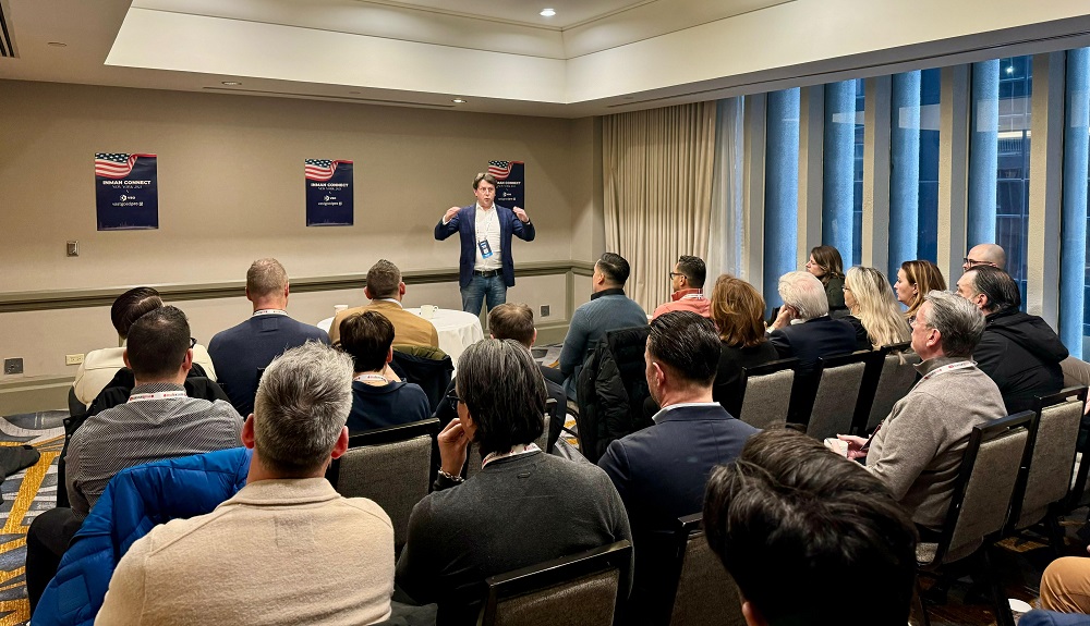 Maarten Colijn praat de deelnemers van de studiereis bij na dag 1 van Inman Connect.
