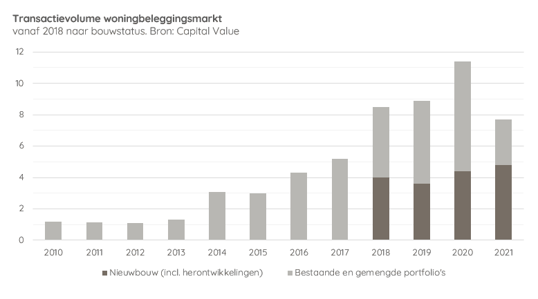 Het totale transactievolume voor de woningbeleggingsmarkt komt in 2021 naar verwachting uit op €7,7 miljard. Dat is een daling van 32,5% van het transactievolume in 2020. Deze daling is met name veroorzaakt door de invoering van de verhoogde overdrachtsbelasting per 1 januari 2021 van 2% naar 8%. Hierdoor hebben veel beleggers hun voorgenomen verkopen voor 2021 al in december 2020 uitgevoerd. De verwachting voor 2022 is dat beleggers meer bestaand bezit zullen gaan verkopen om de portefeuille te verjongen en verduurzamen.