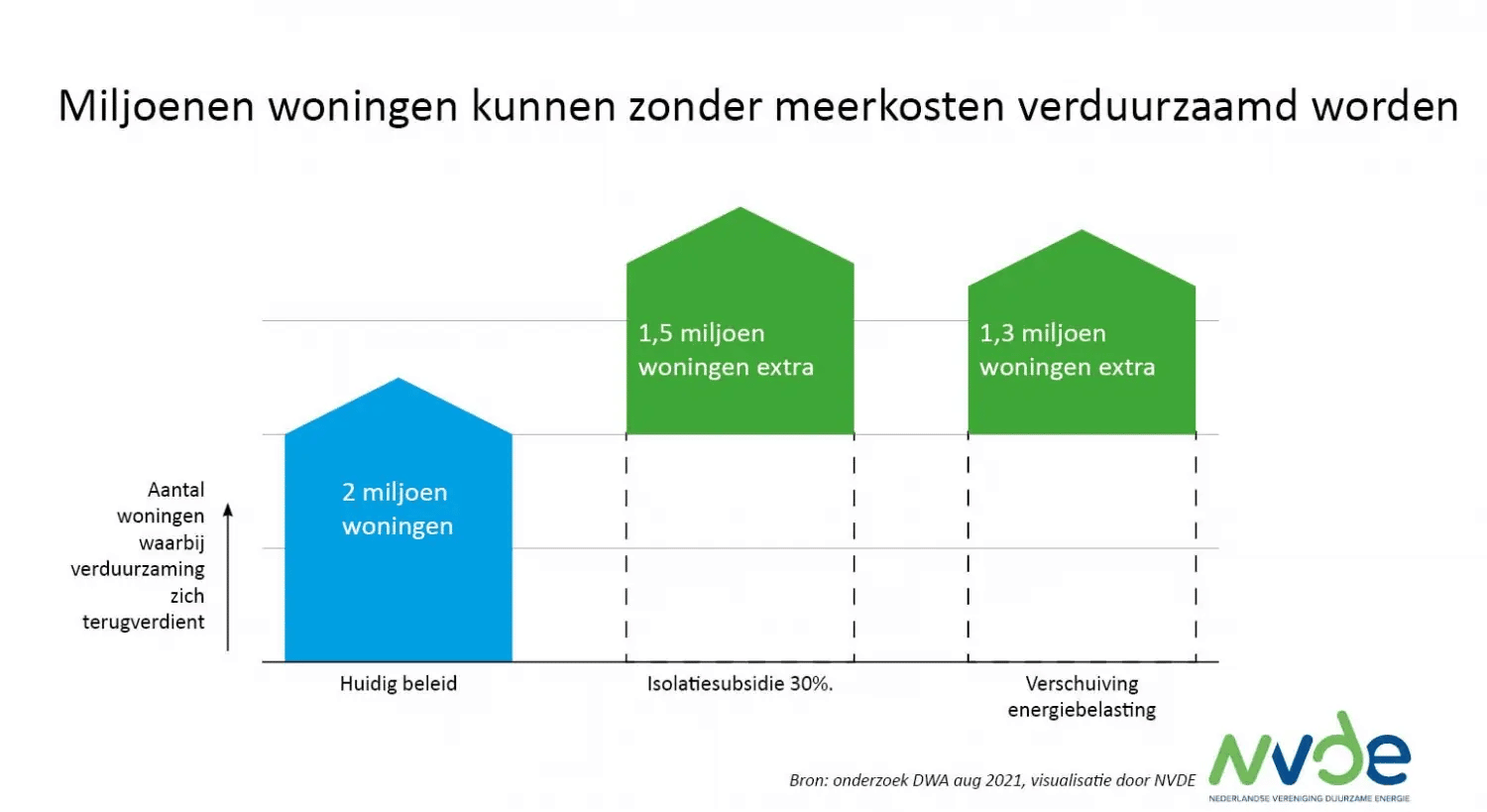 Bij één miljoen huizen is de investering zelfs binnen tien jaar terug verdiend en dus winstgevend, dit blijkt uit onderzoek van DWA, in opdracht van de Nederlandse Vereniging Duurzame Energie (NVDE). Ook bij de huidige hoge gasprijzen zijn meer huizen betaalbaar te verduurzamen en hebben bewoners daar baat bij om hun energielasten te kunnen betalen.