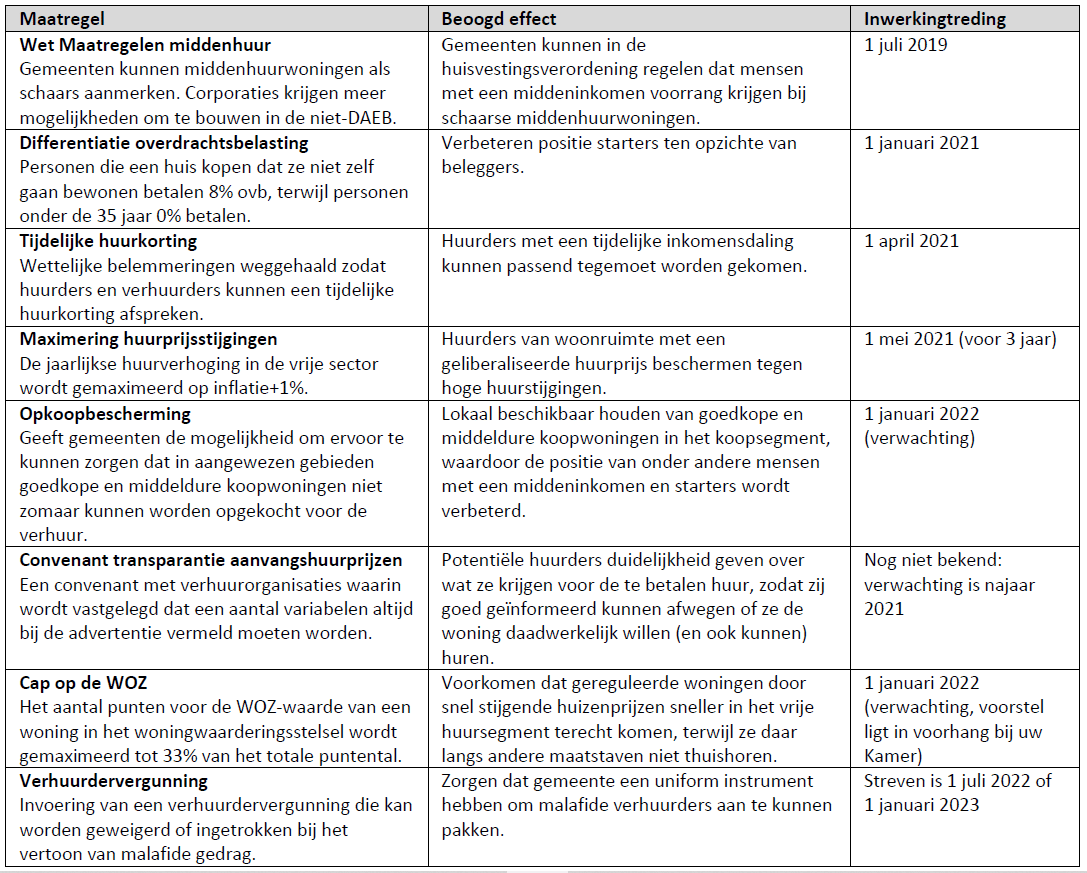 Minister Ollongren heeft ze allemaal nog een keer op een rij gezet. Ze zegt hierover: “Omdat deze maatregelen kortgeleden zijn ingegaan of nog moeten ingaan, is nog niet altijd duidelijk wat het precieze effect van deze maatregelen is op de betaalbaarheid van de huurder en de investeringsbereidheid van de verhuurder. Bij het formuleren van nieuw beleid is het van belang dat goed gekeken worden hoe de verschillende maatregelen op elkaar inwerken. Er moet worden voorkomen dat door een stapeling van maatregelen het doel niet wordt bereikt.”